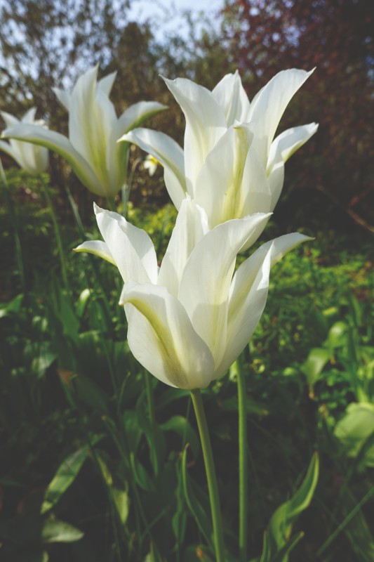 Liljetulpan 'White Triumphator' får enkla, vita blommor. Senblommande. Fin som snittblomma.