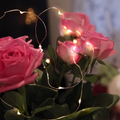 Slingan är silverfärgad och lamporna är varmvita. Batterier ingår