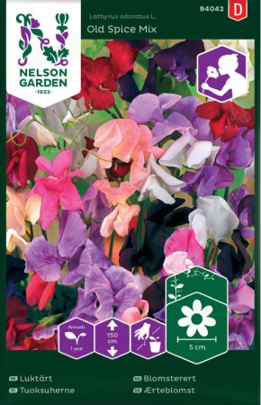 Underbar vad gäller doft och färgrikedom. Blommorna är inte så stora, men förekommer rikligt och doften är förtrollande. Lämplig både för kruka på t ex balkong och i rabatt. Behöver stöd. Trivs i näringsrik, väldränerad jord. Luktärt 'Old Spice Mix' är en blandning av rikblommande luktärter i flera fina färger, lämpliga för både kruka och rabatt.