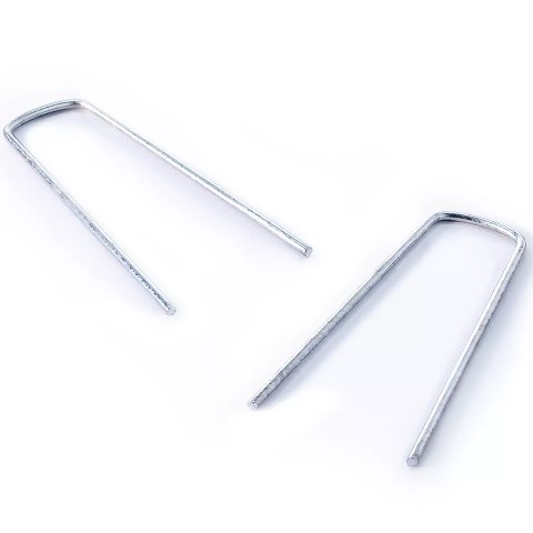Fästen i galvat stål att fästa fiberduk, barkduk, markväv m.m. i marken.