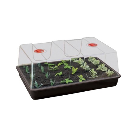 Ett stort Minidrivhus utan dräneringshål som passar bra att fylla med mindre tråg med sådd eller sticklingar. Locket har ventilation.