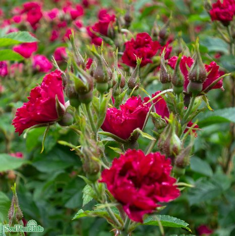 En buskros med tätt, kraftigt och buskigt växtsätt. Blommorna är små, tätt fyllda, karminröda med fransade kanter och sitter i klasar. Saknar doft och bildar inga nypon. Mörkgrönt och glänsande bladverk. Rikligt kontinuerligt blommande* under juni-november.
