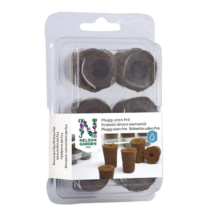 Odlingspluggar för hydroponisk odling. Av komposterbar kokosfiber och torv samt lite näring. Tillsätt eget frö.