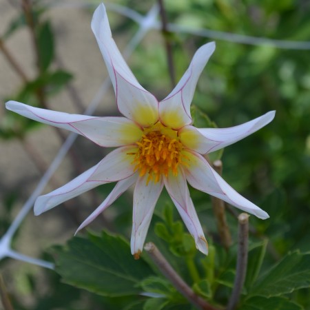Dahlia 'Honka Fragile' är en småblommig orkidédahlia som blommar med blommor som påminner lite om kaktusdahlian, fast enkelblommande. Färgen är vit med rosa kanter. Blommorna blir ca 20-11cm i diameter. Underbar i vacker kruka men även flera i grupp i rabatten. Fin som snittblomma.