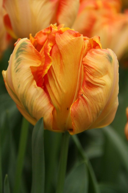 Papegojtulpan 'Parrot King' får vackert vridna, fransiga blommor som är flerfärgade i en aprikos till orangegul nyans, med en hint av grönt. Mycket fin sort, plantera gärna i större grupper. Blomman håller länge och är fin till snitt.