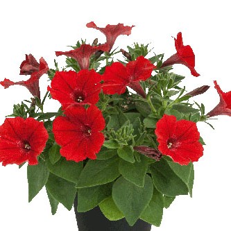 Petunia 'Vista Strawberry' har medelstora blommor som är både värme- och vädertoleranta och får lysande röda blommor.