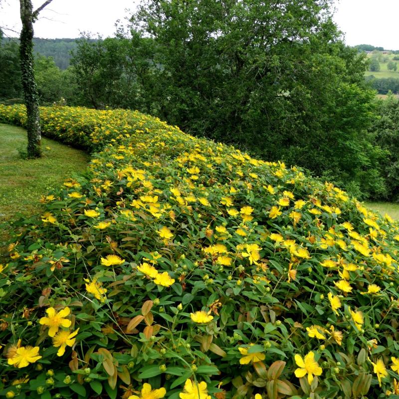 Prakthyperikum är en vacker marktäckande perenn som blommar med stora, solgula blommor under sommaren, vilket lyser upp både rabatter och kanter. Med sina attraktiva blommor och fröhus lockar prakthyperikum pollinatörer som bin och fjärilar, vilket gör den till ett ekologiskt tillskott för trädgården.