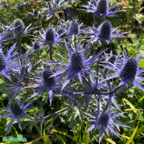 Praktmartorn med ovanligt stora, stålblå tistellika blommor. Högväxande med upprätt arkitektoniskt växtsätt och silvriga blad. Gillas av fjärilar och andra pollinerande insekter. Hållbar snittblomma. Kan torkas till eternell. Vacker vintersilhuett.