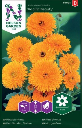 Ringblomma 'Pacific Beauty' är en högt älskad sommarblomma tack vare sina lättodlade och användbara egenskaper. Blommorna är, till skillnad från den vanliga sortens ringblomma, fyllda och blommar i nyanser av gult, orange och aprikos. Ringblomma 'Pacific Beauty' är vacker att odla i både rabatt och grönsaksland och är också jättefin som snittblomma i buketter och arrangemang. Stjälkarna är hållbara och blommorna står länge i vas. Blommorna är ätbara och utgör ett färgglatt inslag i sommarens sallader och drinkar. Kronbladen skördas då precis när blommar slår ut. Smaken är mild, de vackra kronbladen bidrar mest med lysande färgprakt. Bladen kan också torkas till örtte och potpurrier.