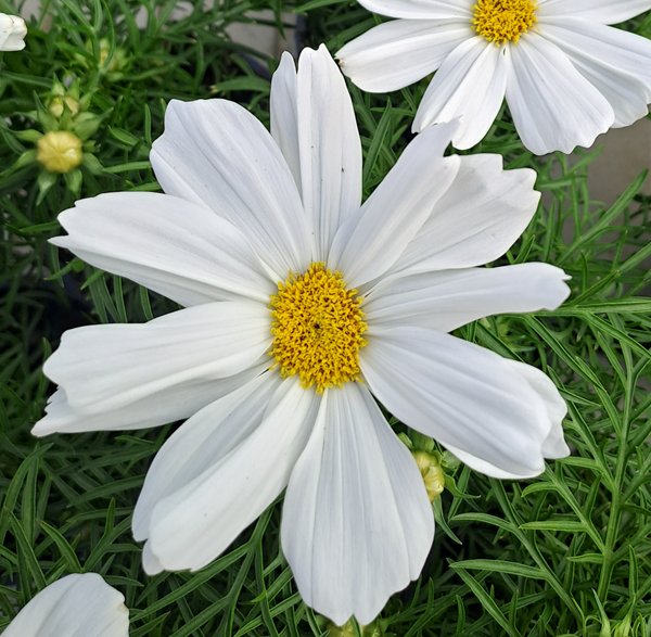 Rosenskära växer på stadiga, halvt förvedade stjälkar. Bladverket är friskt grönt, skirt, finflikigt och liknar dill. Blommorna kan bli decimeterstora. Rosenskära 'Sonata Whitee' får stora vita blommor med gult öga. Rosenskära passar utmärkt som en solitärväxt men också som inslag i sommarplantering och bland perenner. Även i stor kruka. Fin snittblomma.