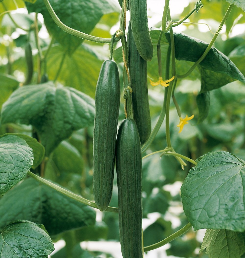 Slanggurka 'Summer Spring' är en partenokarp (självfertil) sort som får ca 30 cm långa, mörkgröna gurkor under lång tid. Hållbara. Bra motståndskraft mot mjöldagg.