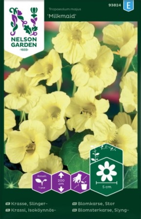 Ljuvligt cremegula blommor med gyllene mitt. Fin att odla i t.ex. ampel, balkonglåda, mot spaljé och som marktäckande växt. Blommorna går att äta, dekorativa i sallader.