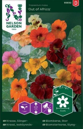 Slingerkrasse/ indiankrasse 'Out of Africa' är en underbar slingrande sommarblomma med vitstrimmiga blad och blommor i olika nyanser av gult, orange och rött. Sommarens sallader får en härlig färgklick om man tillsätter de ätliga blommorna och även fröna kan ätas om de skördas omogna och läggs in på samma sätt som kapris. De inlagda fröerna kan användas som tillbehör till både kött och fisk. Slingerkrassen blir upp till 2 meter hög och är fin att odla i ampel, som marktäckare eller som klätterväxt mot en spaljé.