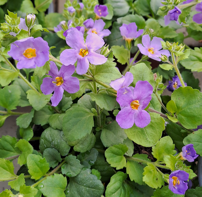 'Blue Showers' är en snöflinga täckt av stora, enkla blå, stjärnformade blommor. Passar som ensamväxt i ampel eller som utfyllnadsväxt i samplanteringar. Ses som väldigt lättskött då de vissna blommorna ramlar av och växten fortsätter blomma hela säsongen.