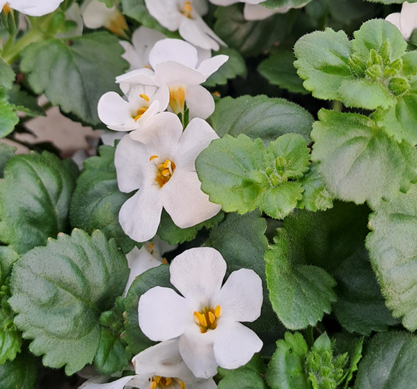 Snöflinga heter även 'Sutera cordata' på latin och kommer från det indonesiska namnet 'sutera' för silke och 'cordis' för hjärta som syftar på de gröna hjärtformade bladen. Snöflingan växer lågt, mattbildande och rankbildande.