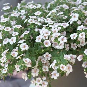 'Falls Pink Eye' är en snöflinga täckt av vackra enkla, vita, stjärnformade blommor med rosa mitt. Passar som ensamväxt i ampel eller som utfyllnadsväxt i samplanteringar. Ses som väldigt lättskött då de vissna blommorna ramlar av och växten fortsätter blomma hela säsongen.