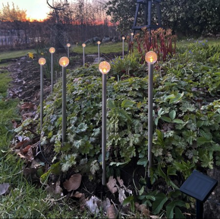 Bubbly 10-Pin är en vacker solcellsdriven dekoration som lyser upp i mörkret. Denna solcellsbelysning har 10 pinnar i en höjd av cirka 30cm där en bubbelkula sitter i toppen som lyser med ett varmvitt sken. De 10 solcellspinnarna sitter ihop med 30cm kabel och den totala längden blir ca 270cm. Denna solcellsdekoration är fin att dekorera med i trädgården eller på en balkong. Själva paneldelen har 200cm kabel vilket gör det lätt att placera den i solen för att ladda batteriet som medföljer.