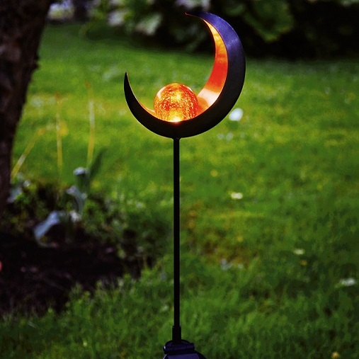 Månskära med glaskula på pinne. Drivs av solenergi och har 1 LED-ljuskälla. Fin dekoration att placera i entrén, på stigen och i trädgården. Lyser upp och ger ifrån sig ett fint sken.