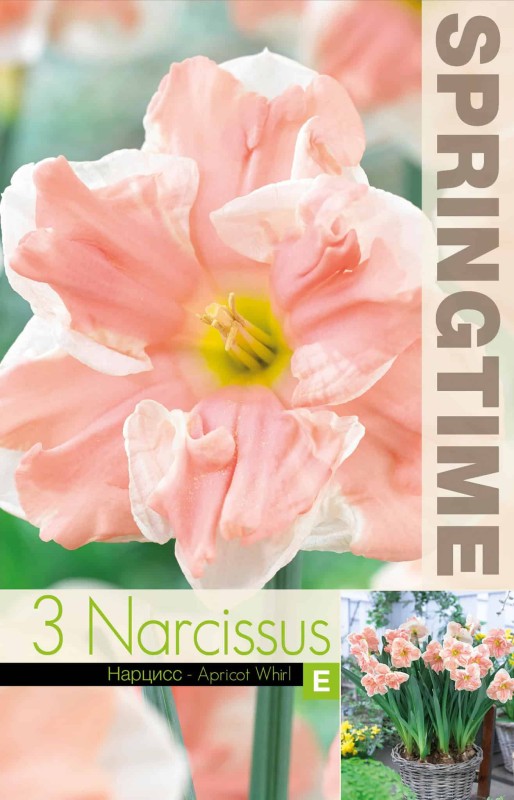 Stjärnnarciss 'Apricot Whirl' med vita kronblad och bred aprikosrosa krona. Fin både i rabatt och kruka. Fin snittblomma. Vill ha en näringsrik jord som är väldränerad. Återkommer år efter år. Härdig i större delen av landet. Trivs i full sol.
