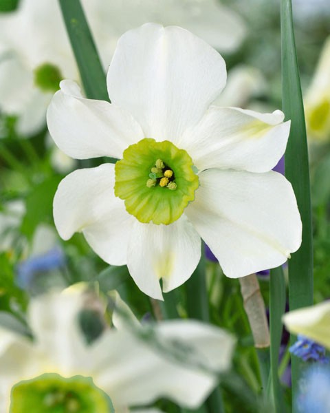 Stjärnnarciss 'Sinopel' även kallad Pingstlilja har vita blommor med en krona som skiftar från grönt till gult. Enkelblommande.