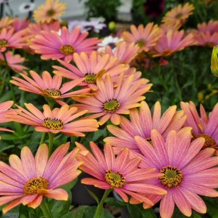 Stjärnöga 'Summersmile Sunrise' är en storblommig, enkelblommande sommarblomma med en rosa, lila och aprikosfärgad ton.