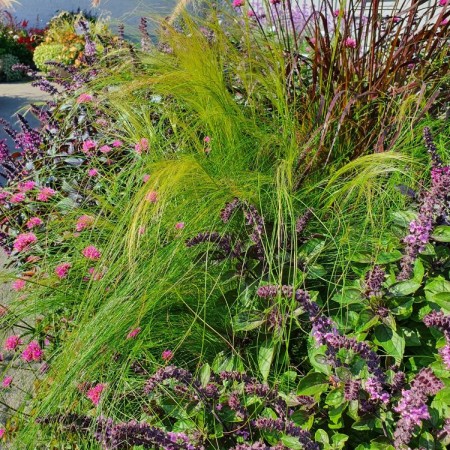 Svansfjädergräs är ett sirligt gräs som växer i tuvor. De gröna stråna är smala, mjuka och överhängande. De silkeslika axen som kommer under sensommaren gör svansfjädergräset ännu vackrare. Böljar i vinden och skapar en vild känsla av äng i såväl blomsterrabatten som i samplanteringar i krukor. Vackert tillsammans med träd, buskar och perenner. Även säsongsväxter. Ger rörelse och liv åt alla planteringar.