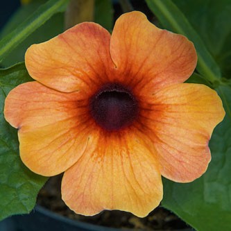 Svartöga 'Amera Mango Eye' är en unik, exotisk klätterväxt som hinner växa sig stor under en sommar där den trivs. Blommar hela sommaren. Svartöga 'Amera Mango Eye' får orange till lätt rödfärgade blommor med svart mitt. Äggrunda, fräscht gröna blad. Bladen är håriga, grågröna. Behöver växtstöd i form av en spaljé eller obelisk. Klipp gärna bort överblommat. Lättskött.
