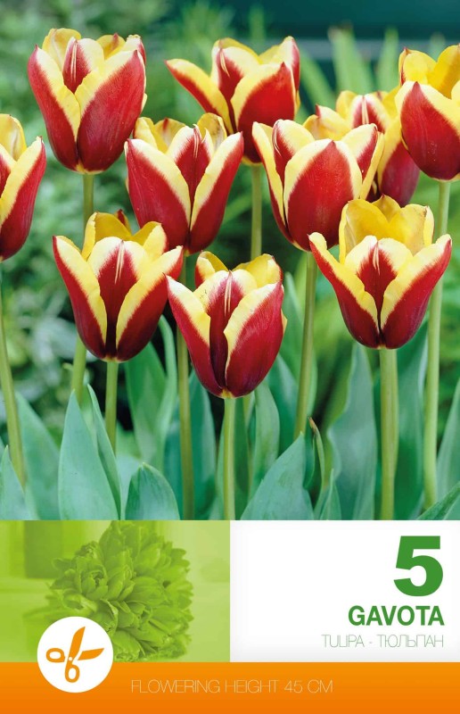 Tulpan 'Gavota' är en iögonfallande tvåfärgad tulpan med mörkt röda blommor med gul kant. En riktigt snygg kontrast! Blommorna passar utmärkt som snittblomma.