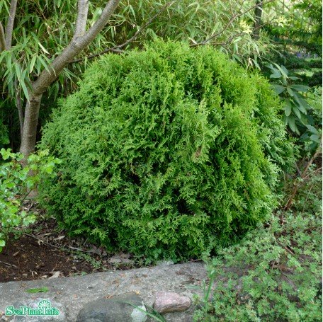 Klotformad tuja vars form med tiden blir plattrund. Friskt gröna barr som får en bronsfärgad nyans på vintern. Kompakt och tätt växtsätt. Långsamväxande. Fin både som solitär och i grupp.