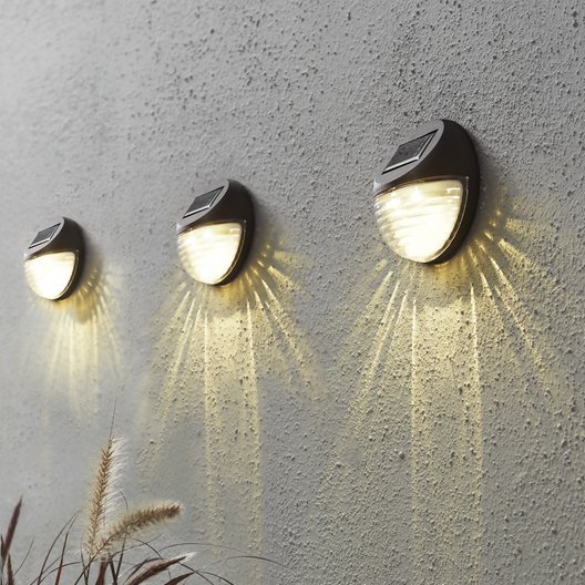 Solcellsdrivna vägglyktor i 3-pack. Lyktorna har varsin LED-ljuskälla som ger ifrån sig ett varmvitt ljus. Utmärkta till att sätta på fasaden och staketet.
