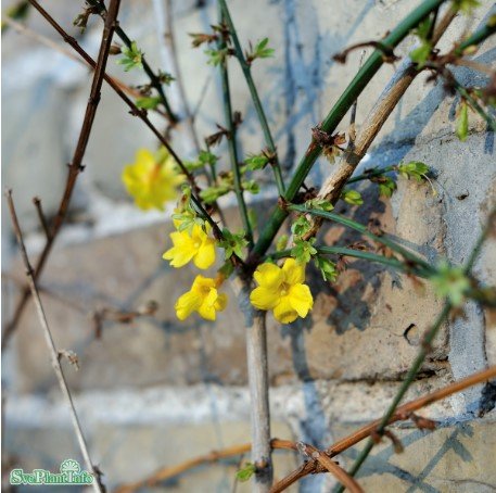 Buske med överraskande gula blommor som vid rätt förhållande kan stå i blom mitt i vintern. Den blommar på bar kvist i jan-mars. Bladverket och dess grenar är gröna och behöver bindas upp för att kunna utvecklas.